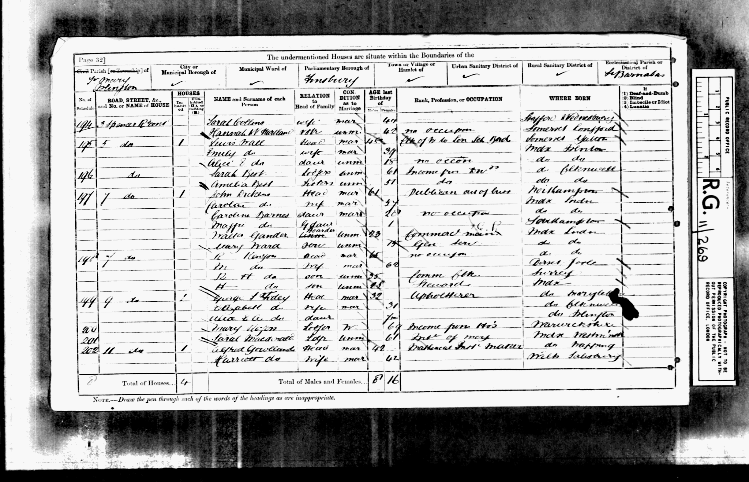 | RG11_0269_032 | Alfred and Harriett Gowlland | 11 Spencer Road | Islington Middlesex | Alfred Gowlland (Head - M - 42 - Mathematical Instrument Maker - b Wapping Middx) / Harriett Gowlland (Wife - 42 - b Salisbury Wilts) | ||||||