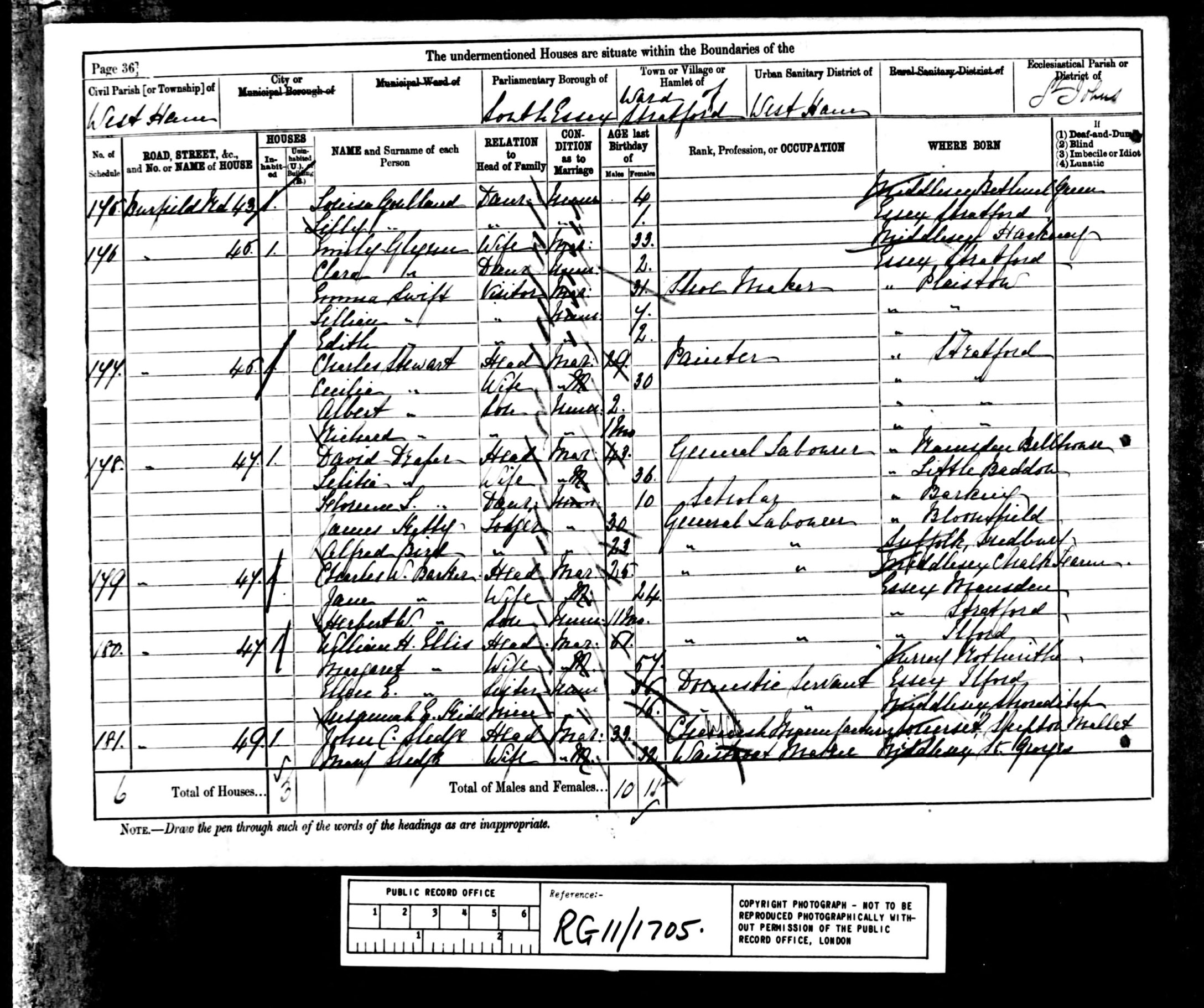 | RG13_0160_003 | David Standing and family | 44 Elthorne Street | St John's, Islington | David J Standing (Head - W - 50 - Shoemaker - b St Pancras) / Amy E Standing (Daughter - 23 - Housekeeper - b St Pancras) / James Standing (Son - 21 - Labourer - b St Pancras) / Esther Standing (Daughter - 16 - General Servant Domestic - b Islington) / Charles Standing (Son - 14 - b Islington) | ||||||