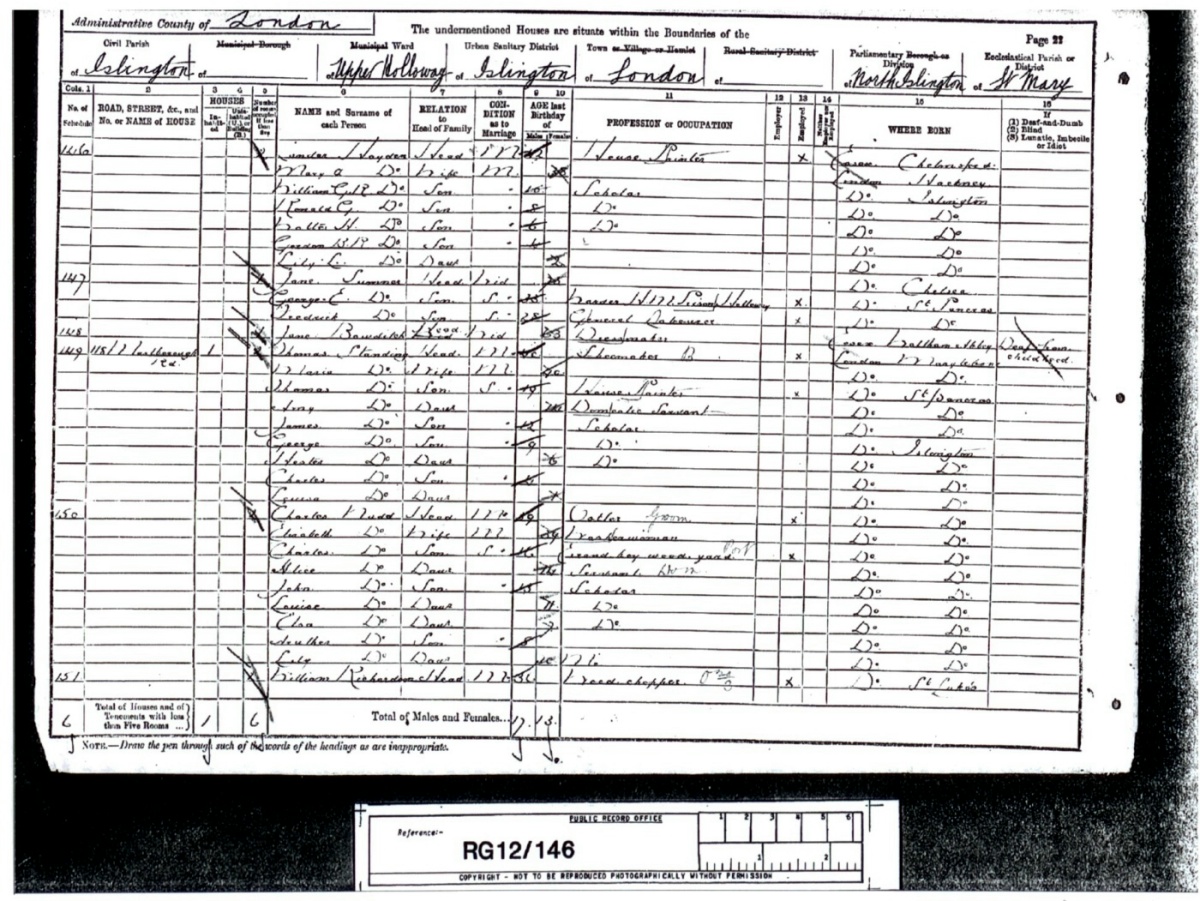 | RG12_0178_031 | Alfred engineer Gowlland and family | 11 Spencer [?] Road | Highbury Islington | Alfred Gowlland (Head - M - 51 - Telegraph Engineer (Electrical) - b Wapping London) / Harriet Gowlland (Wife - 51 - M - b Salisbury Wiltshire) / Francis E (Son - 19 - S - Clerk Insurance - b Islington) / Edith E (Daughter - 15 - S - Scholar - b Islington) / Charles A Skelton (Brother [in law] - 64 - W - Army Pensioner - b Salisbury Wiltshire) / Alice J Gowlland [?] (Niece - 18 - S - Milliner Dress - b Enfield Middlesex) | ||||||