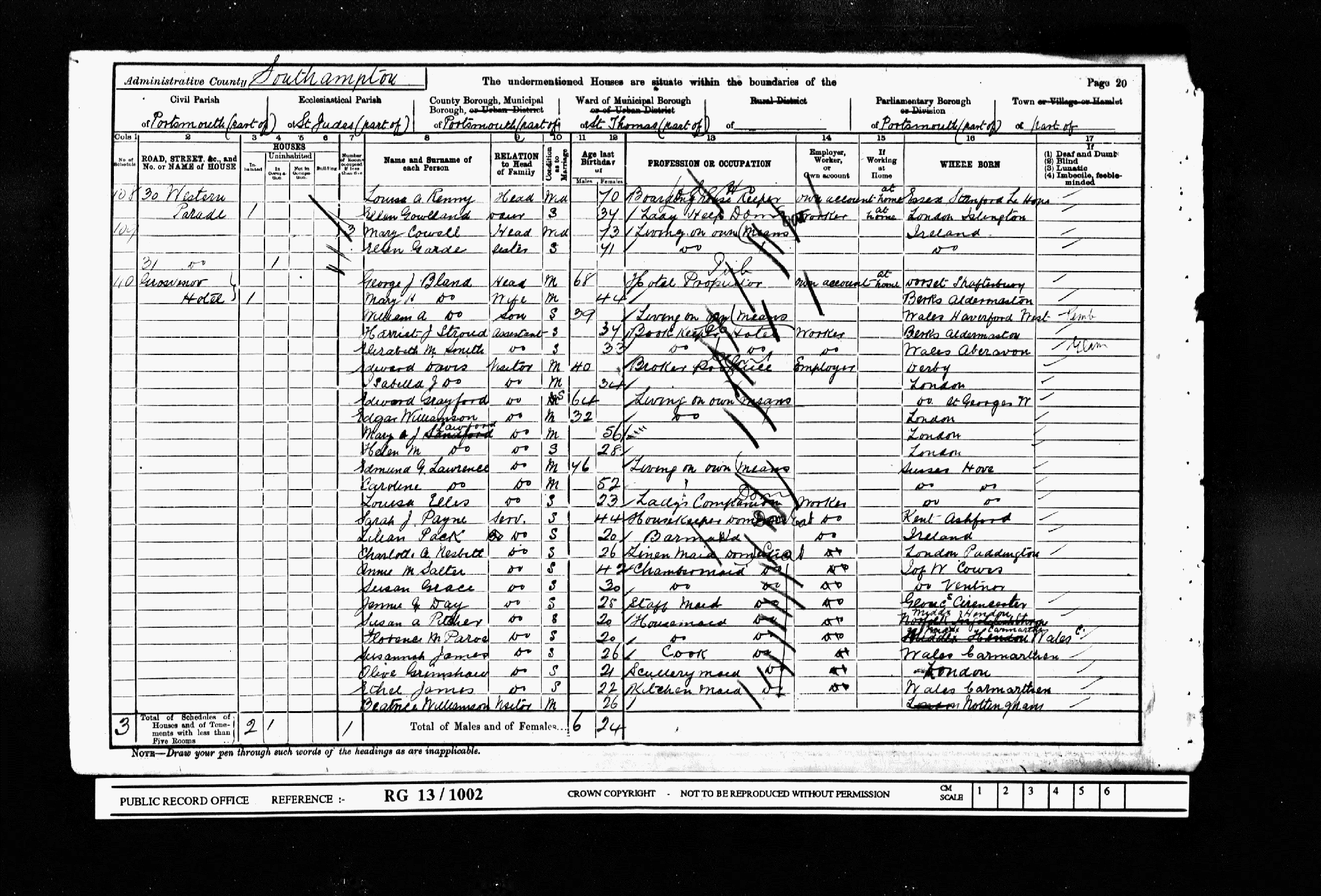 | RG13_1002_020 | Louisa Remy and Ellen Gowlland | 30 Western Parade | Portsmouth Southampton | Louisa A Remy (Head - W - 70 - Boarding House Keeper - b Stanford Le Hope Essex) / Ellen Gowlland (Daughter - S - 37 - Lady Help Domestic - b Islington London) | ||||||