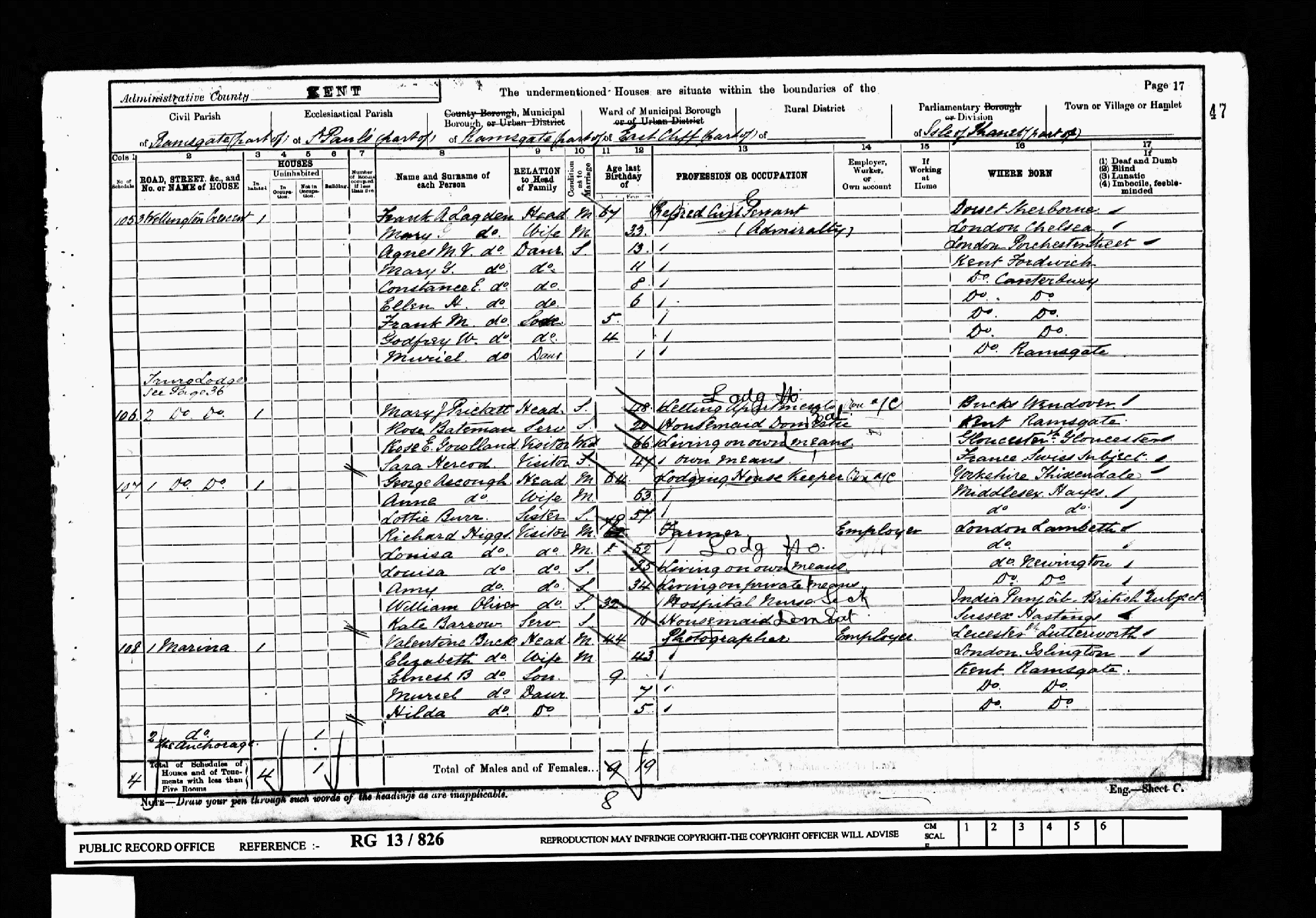 | RG12_0026_004 | Alma Mayes Pocklington and family | 70 Cornwall Place | All Saints Kensington London | Alma Mayes Pocklington (Head - Widow - 36 - Landlady - b Islington London) / Thomas Pocklington (Son - 8 - b Vange Essex) / Florence Pocklington (Daughter - 5 - b Vange Essex) / Dorothy Pocklington (Daughter - 1 - b Vange Essex) / Arthur Gowlland (Brother - 35 - Company Secretary - b De Bewna Town [Actually Sandgate Road, Hackney] London) / Edith Leighton (Servant - U - 19 - Domestic Servant - b Long Stratton Norfolk) | ||||||