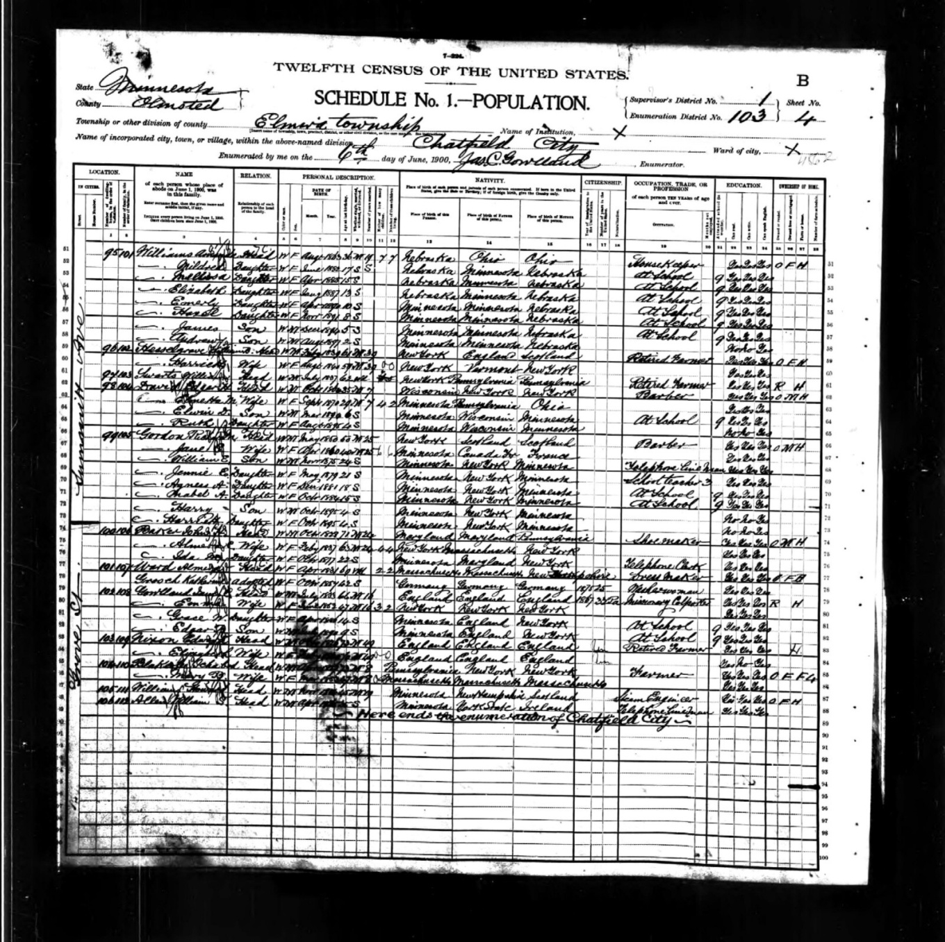 | US1900_103_0004 | James Carter Gowlland | Elmeria Township | Olmsted County Minnesota | James Carter Gowlland (Head - 66 - rents - Missionary? ?? - b England) / Emma Gowlland (Wife - 47 - b New York) / Grace Gowlland (Daughter - 14 - b Minnesota) / Edgar Gowlland (Son - 9 - b Minnesota) | ||||||