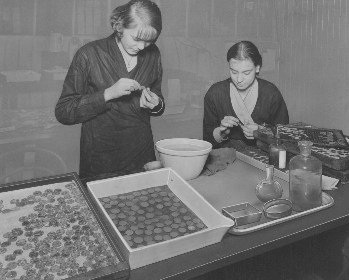Cleaning (inside fume cupboard) newly silvered dental mirrors |