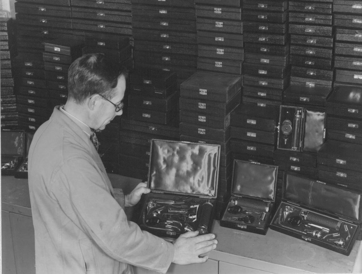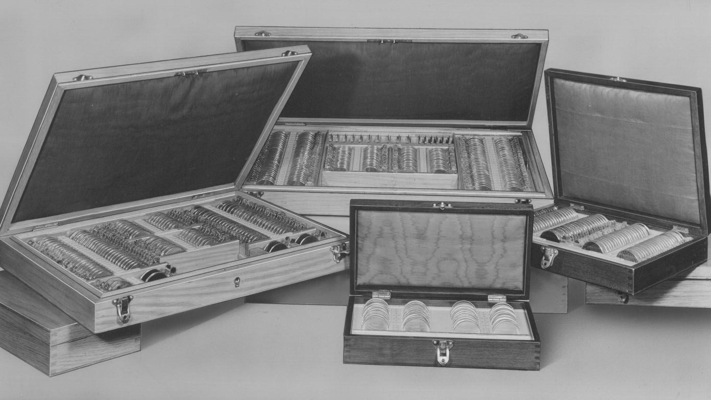 Checking miniature lenses and assembling into lens train of Morton ophthalmoscope |